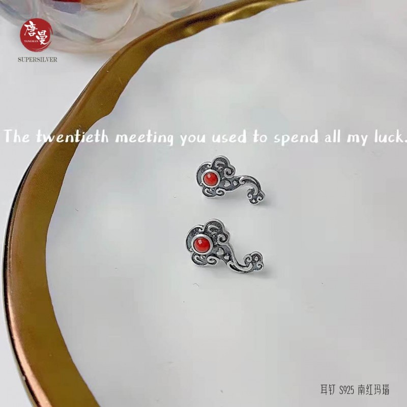 如意耳钉---- 纯银镶嵌南红玛瑙