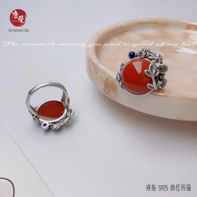 花开富贵纯银镶嵌南红戒指