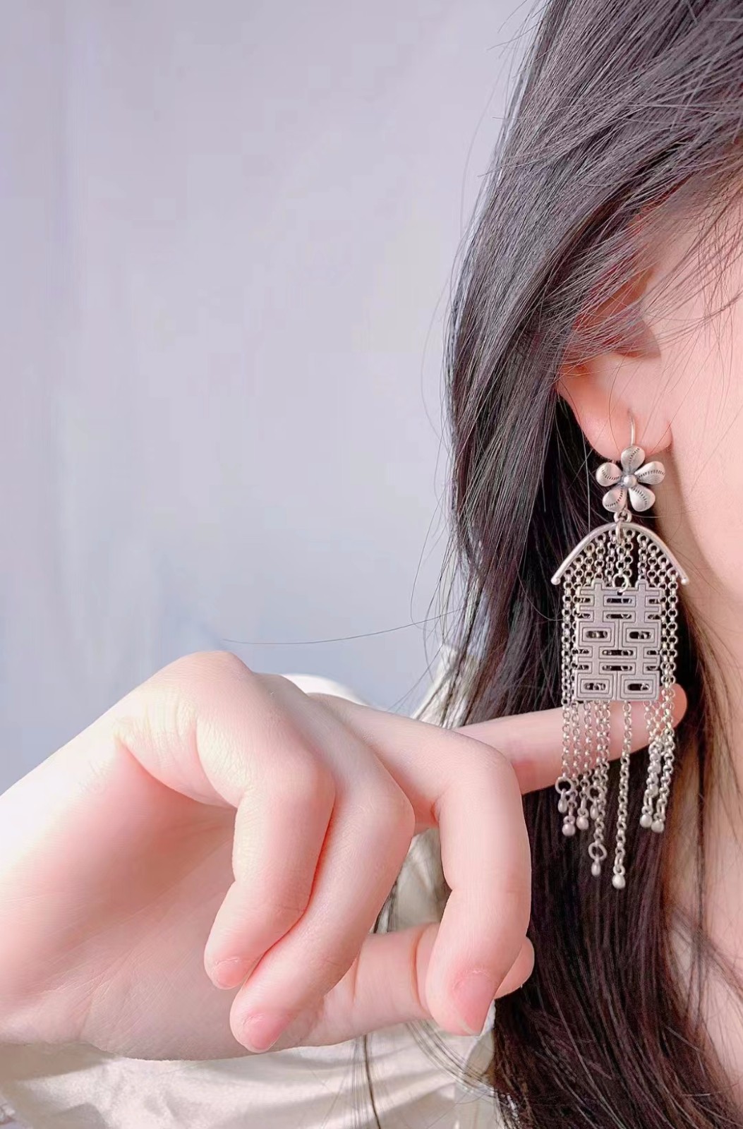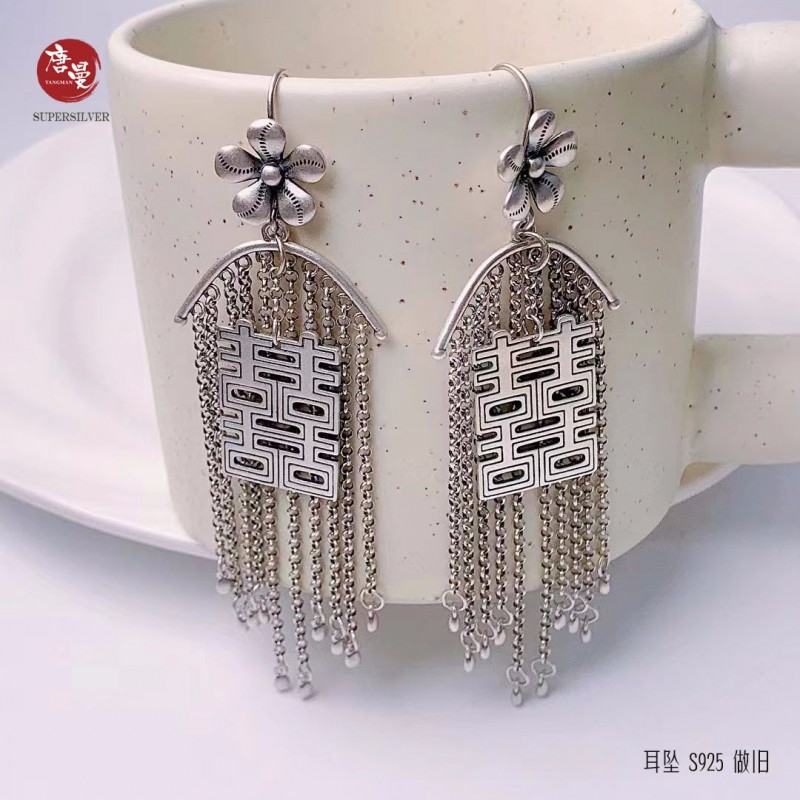 双喜临门项坠 耳坠套系纯银做旧流苏风,时尚喜气灵动十足