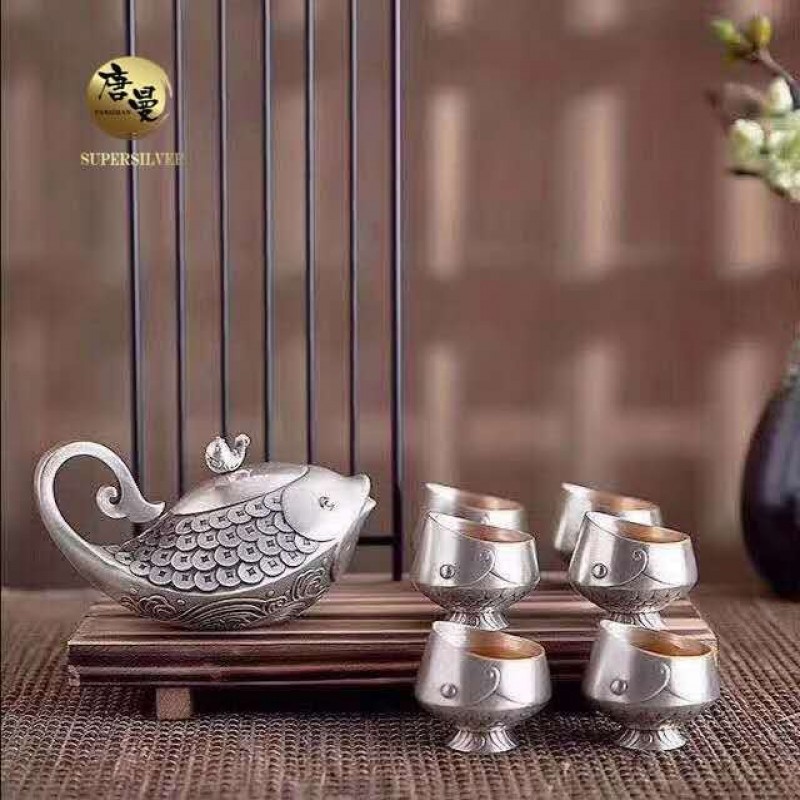 “鱼”与“余”谐音,喻意年年有余、事事有余,鱼多子又有多子多孙的喻意。宋代有以黄金制作的鱼符,象征着富贵与权势。作品以鱼为设计元素,大鱼为壶,背有小鱼,代表辈辈有余;鱼身有水,如鱼得水,如人得势;鱼鳞如铜钱状,象征财源滚滚,在商业上有赢利有余之吉祥喻意。小鱼为杯,张开大嘴承接大鱼壶中的茶水,有父传子、子传孙的世代绵延之余庆。