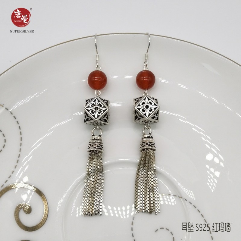 红玛瑙流苏耳坠 S925 作旧
