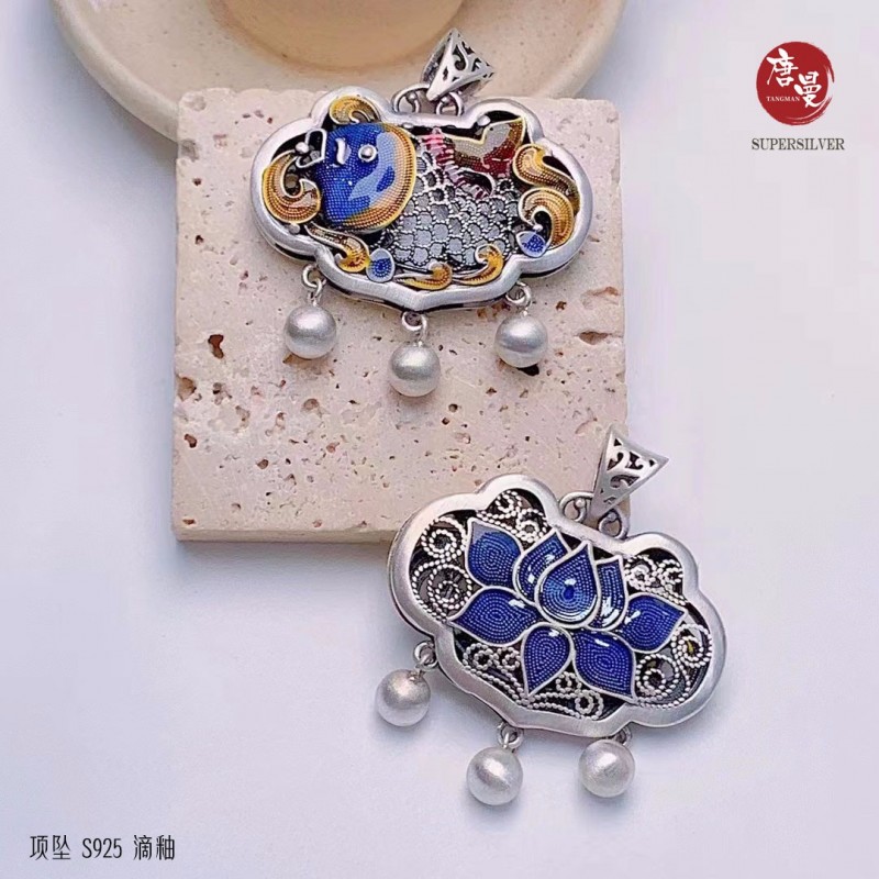 鱼戏莲花双面 镂空花丝项坠