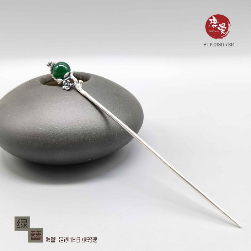 足银 作旧 绿玛瑙 长度:15.5厘米
