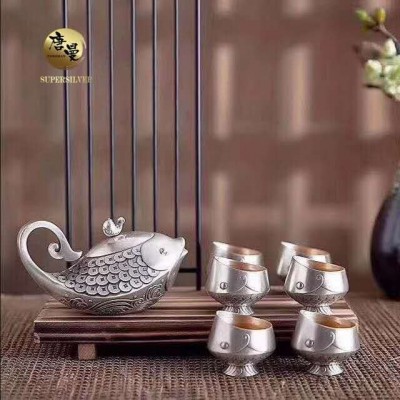 “鱼”与“余”谐音,喻意年年有余、事事有余,鱼多子又有多子多孙的喻意。宋代有以黄金制作的鱼符,象征着富贵与权势。作品以鱼为设计元素,大鱼为壶,背有小鱼,代表辈辈有余;鱼身有水,如鱼得水,如人得势;鱼鳞如铜钱状,象征财源滚滚,在商业上有赢利有余之吉祥喻意。小鱼为杯,张开大嘴承接大鱼壶中的茶水,有父传子、子传孙的世代绵延之余庆。