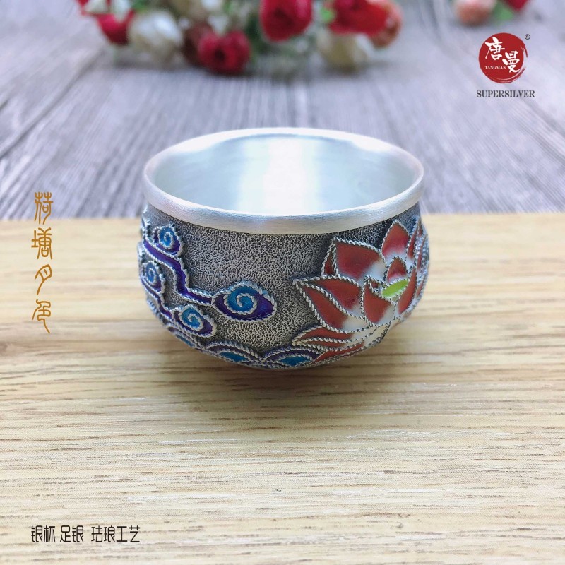 【荷塘月色】 银茶杯 珐琅工艺 52克左右